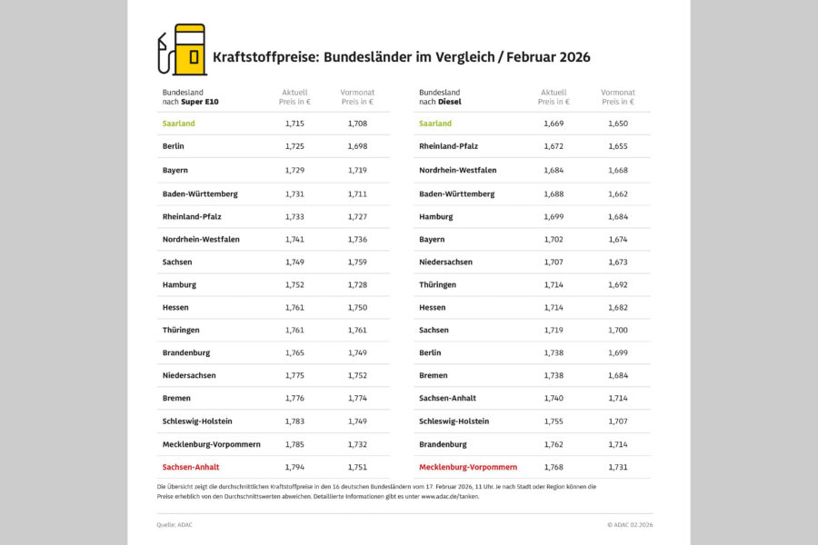 Für diese Untersuchung hat der ADAC die Preisdaten von mehr als 14.000 bei der Markttransparenzstelle für Kraftstoffe erfassten Tankstellen ausgewertet und den 16 Bundesländern zugeordnet. Die ermittelten Preise stellen eine Momentaufnahme vom 17. Februar 2026 (11 Uhr) dar.