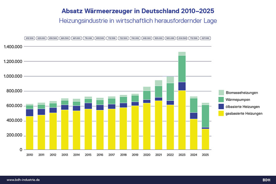 Der Absatz von Heizungen ist in Deutschland im Jahr 2025 auf den niedrigsten Stand seit 15 Jahren gefallen. Das zeigt die Jahresbilanz, die der BDH Bundesverband der Deutschen Heizungsindustrie e. V., Köln, am 01. Februar 2026 vorgelegt hat. Demnach setzten die Hersteller im vergangenen Jahr nur rund 627.000 Anlagen ab – 12 % weniger als im bereits schwachen Vorjahr. Damit ist der Heizungsmarkt in Deutschland das zweite Jahr in Folge rückläufig.