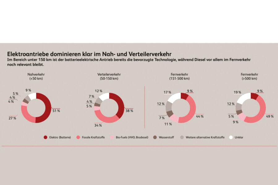 Parallel spielt das Kostenmanagement weiterhin eine zentrale Rolle: Für 51 % der Befragten ist es derzeit das wichtigste Thema – noch vor Fachkräftemangel (35 %) oder der Umstellung des Antriebs (16 %). Diese Priorisierung zeigt, dass viele Unternehmen aktuell auf wirtschaftliche Stabilität setzen, bevor sie größere Transformationsinvestitionen angehen. Trotz aller Hindernisse sehen die Befragten besonders im Nah- und Verteilerverkehr batterieelektrische Antriebe in den kommenden fünf Jahren als die wahrscheinlichste Lösung (51 % beziehungsweise 38 %).