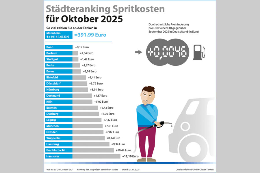 Im monatlichen Preisranking von Clever Tanken unter den 20 größten deutschen Städten belegte Mannheim im Oktober erneut Platz eins in der Kategorie der günstigsten Super-E10-Tankstädte. Im Monatsdurchschnitt kostete der Liter dort 1,6333 Euro. Auf den Plätzen zwei und drei folgten Bonn (1,6341 Euro) und Bochum (1,6389 Euro).