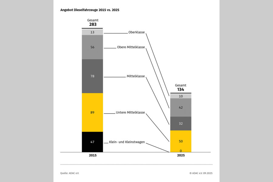 Betrachtet wurde der Zeitraum zwischen 2015 und 2025 anhand von Daten aus der ADAC-Autodatenbank. In dieser Zeit nahm das Angebot an Dieselfahrzeugen in Deutschland um mehr als 50 % ab. Besonders prekär ist die Entwicklung bei den Kleinst- und Kleinwagen: Gab es vor zehn Jahren noch 47 Fahrzeugmodelle mit Dieselmotor, so ist dieses Segment heute ausgestorben – kein einziges Auto wird mehr angeboten. In der Mittelklasse, in der ein Selbstzünder früher quasi Standard war, hat sich das Portfolio mehr als halbiert. Besonders bei den Kombis ist das Angebot merklich geschrumpft – ganze fünf Modelle stehen heute noch zur Auswahl.