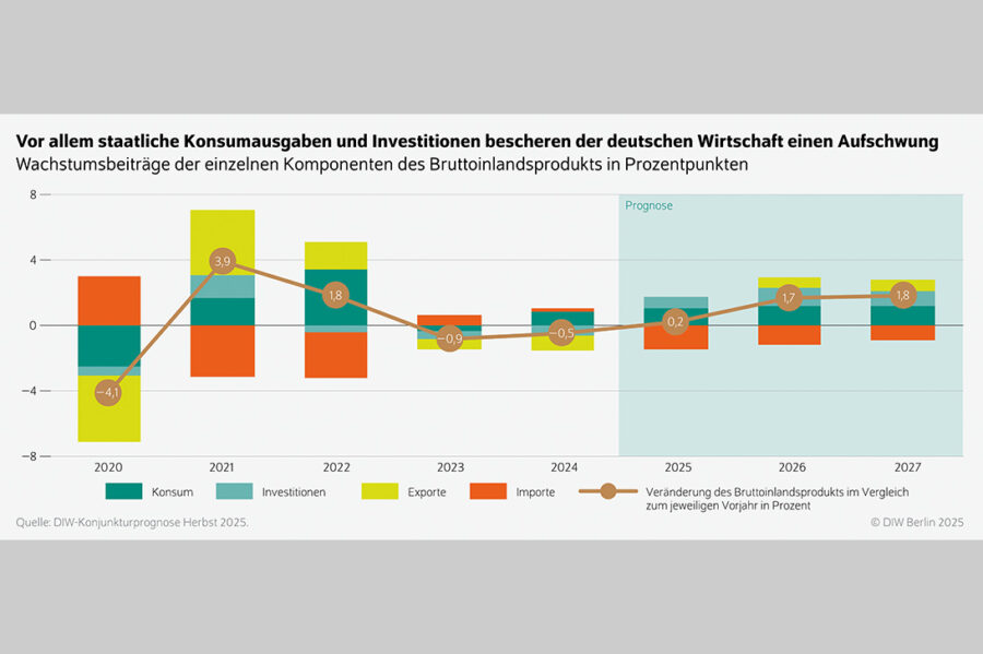 Für 2025 revidiert das DIW Berlin seine vorherige Prognose ein wenig nach unten. Die erste Jahreshälfte verlief holprig – nach einem schwungvollen Start, der aber vor allem an vorgezogenen Exporten angesichts der drohenden US-Zölle lag, ging es gleich wieder bergab. In den kommenden Jahren dürften die öffentlichen Mehrausgaben nach Einschätzung des DIW Berlin immer stärker ihre Wirkung entfalten: 2026 wird sich das Wachstum wie bereits in der Sommerprognose erwartet wohl deutlich beschleunigen. Für 2027 wird ein Plus in ähnlicher Größenordnung prognostiziert.