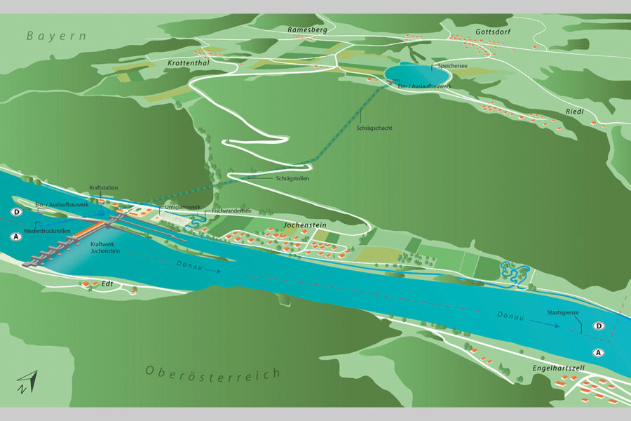 Ein neuer 24 ha großer Speichersee mit einem nutzbaren Fassungsvermögen von rund 4 Mio. cbm Wasser wird als Oberbecken verwendet. Von diesem führt ein unterirdischer sicherer Stollen zu einer ebenfalls unterirdischen Kraftstation beim Kraftwerk Jochenstein. Dort befinden sich die beiden hochflexiblen Maschinensätze mit je 150 MW Leistung. Die dort erzeugte elektrische Energie wird in die bestehende Schaltanlage des Donaukraftwerkes Jochenstein eingespeist. Die ökologisch hochwertigen Donauleiten werden durch das Projekt nicht berührt, da sich die Bauwerke tief im Berg darunter befinden.