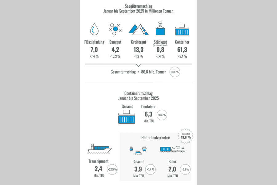 Der Seegüterumschlag kann in den Monaten Januar bis September 2025 ein Wachstum auf 86,8 Mio. t (+ 3,4 % im Vergleich zum Vorjahreszeitraum) verzeichnen. Dieses Wachstum wurde, wie bereits in den ersten sechs Monaten des Jahres, von einer positiven Entwicklung des Containerumschlags getragen, welcher auf 6,3 Mio. Standardcontainer (TEU) (+ 8,4 %) stieg. Auf Tonnenbasis wuchs der containerisierte Stückgutumschlag auf 61,3 Mio. t (+ 5,4 %).
